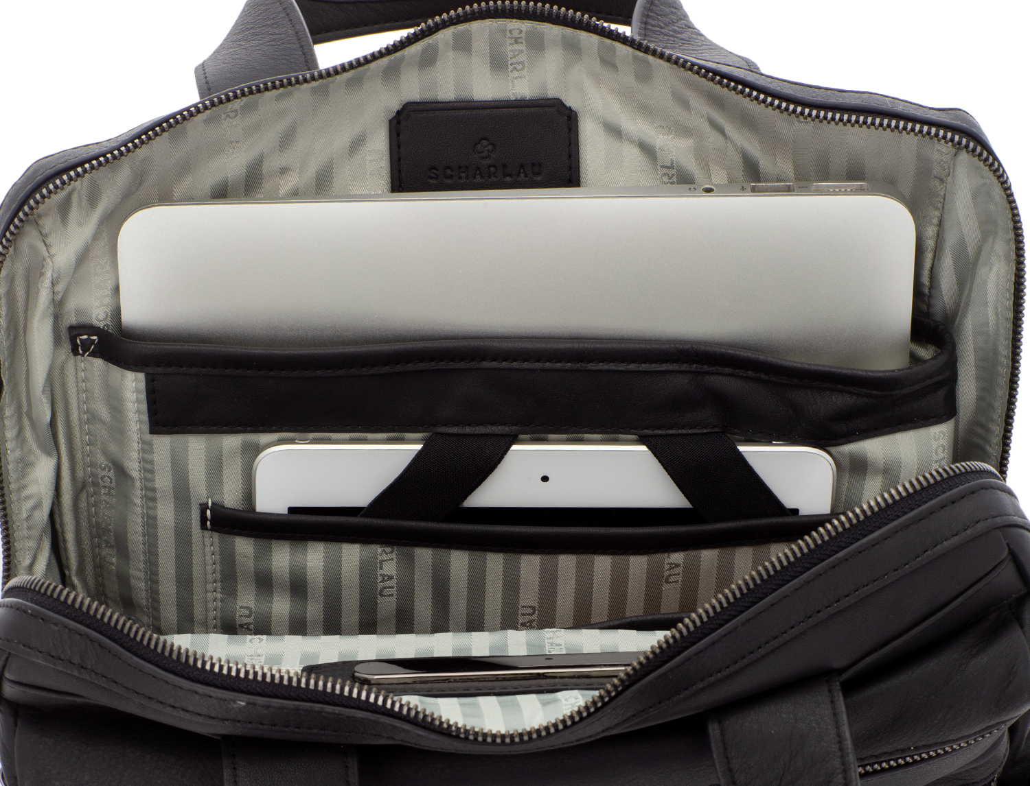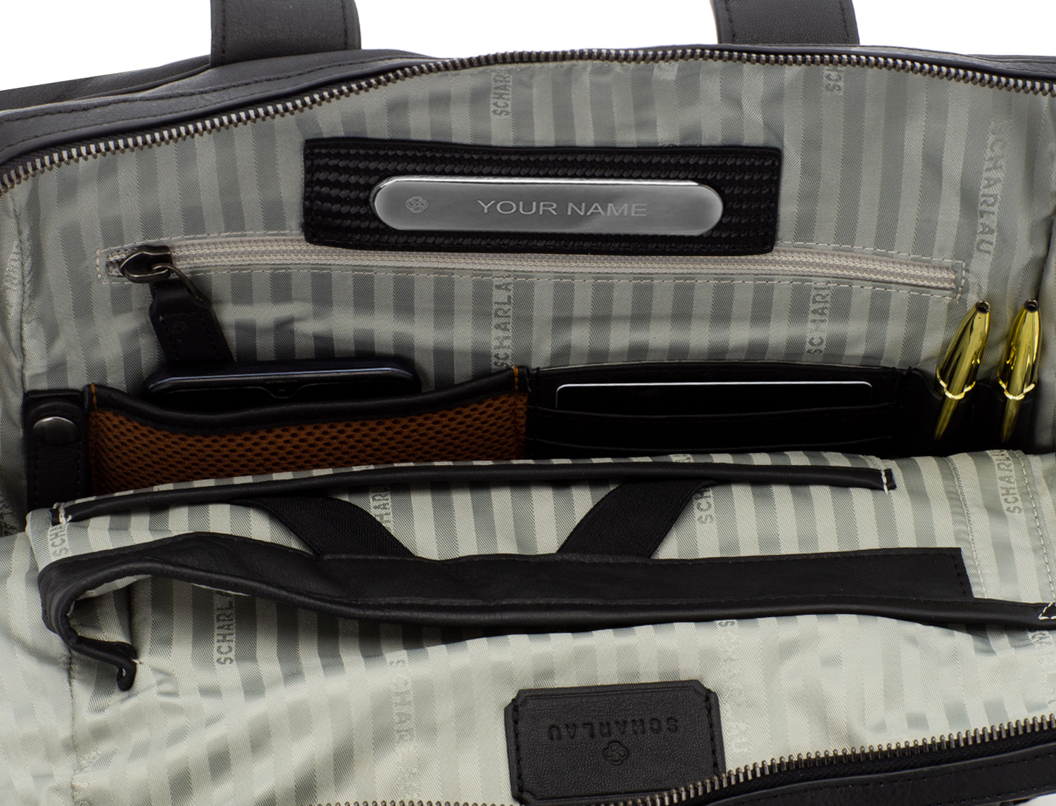 Tasca interna con zip, porta carte, tasca per cellulare e portapenne